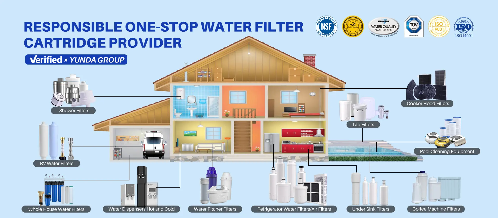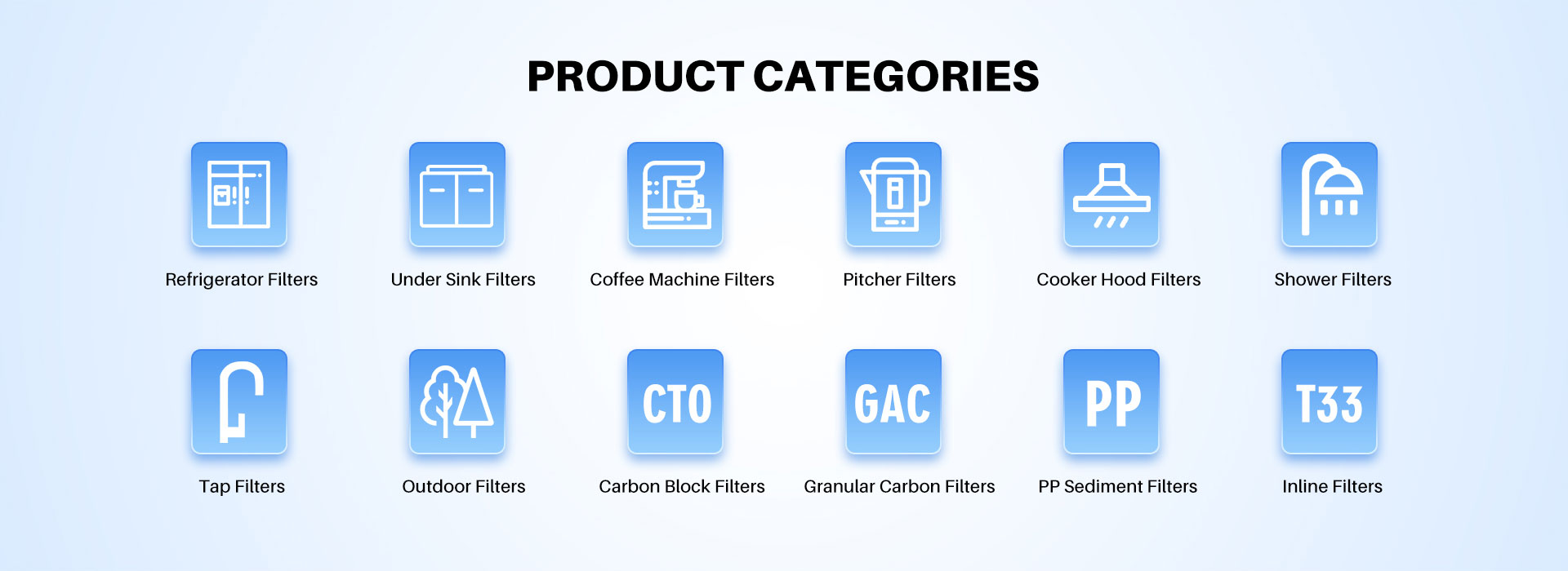 Prodotti principali: Filtri per l'acqua del frigorifero, filtri per macchine da caffè, filtri per l'acqua del lavandino, cartucce per filtri per l'acqua, filtri per piscina e Spa